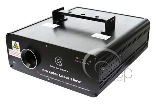 Zelený laser o výkonu 500mW (532nm). Vysokorychlostní optický skener s kvalitními motorky 25K a širokým vyzařovacím úhlem. Ovládání signálem DMX (14 kanálů), hudbou díky zabudovanému mikrofonu nebo pomocí PC. Automatické provozní režimy Auto-Beam a Auto-Animation, funkce Maser/Slave. Světelný efekt vytváří řadu zajímavých obrazových vzorů a prostorových efektů. Laser má přednastaveno 256 grafických scén (vrstvy, mřížky, tunely, vlny, postavy apod.) a 128 animačních scén. DB25/M ILDA rozhraní pro ovládání PC.